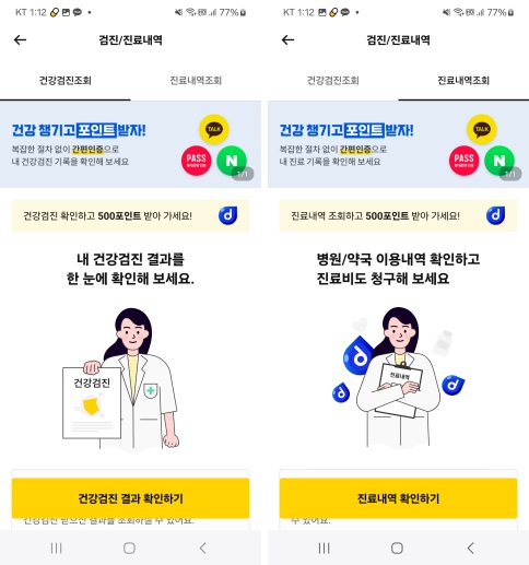 여러분의 건강검진 결과나 병원/약국 이용내역을 확인하면 1회에 한하여 각각 500포인트를 받을 수 있다고 합니다.