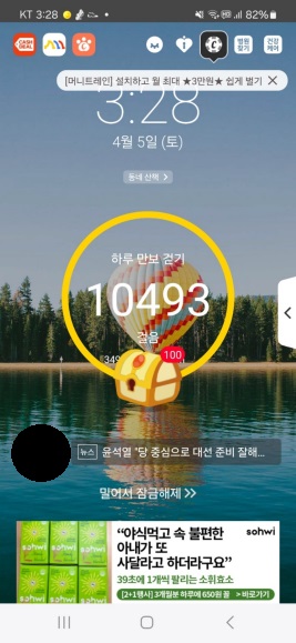 걸어서 쌓은 캐시는 잠금화면에 있는 보물상자 버튼을 눌러 받을 수 있습니다. 보물상자를 일정횟수만큼 누를 때마다 작은 팝업 광고가 나타나지만, 닫기 버튼 한 번이면 사라져서 이용에 방해될 정도는 아닙니다. 참고로, 내일(0시)이 되면 걸어서 쌓은 캐시가 전부 사라지기 때문에 그 전까지 반드시 받아줘야 합니다.
