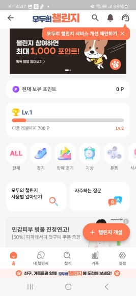 모두의 챌린지에서 제공되는 보상은 포인트로, 일정량 만큼 모았다면 캐시로 전환할 수 있습니다. 또, 레벨업을 할 수도 있지요! 레벨업을 하면 보너스 포인트를 받을 수 있습니다.