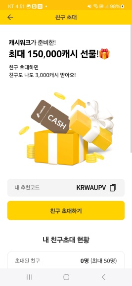 그러면 이렇게 가만히 있을 때가 아닙니다. 어서 빨리 알려주세요! 여러분의 추천코드와 함께 말입니다. 왜냐하면 캐시워크를 처음 이용하는 분이 여러분의 추천코드를 입력하고 가입하면, 새로 가입하는 분과 여러분 모두 3천 캐시를 받을 수 있으니까 말입니다!