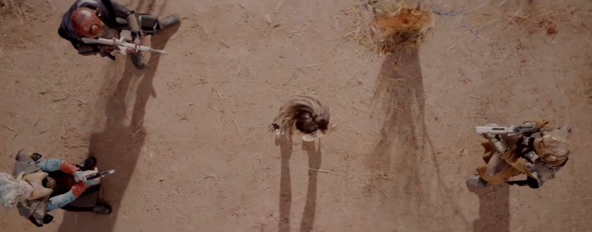 재빨리 자세를 낮춰 공격을 피해 두 명은 서로 쏘게 만들고, 나머지 한 명은 순식간에 제압하여 일격을 날립니다.