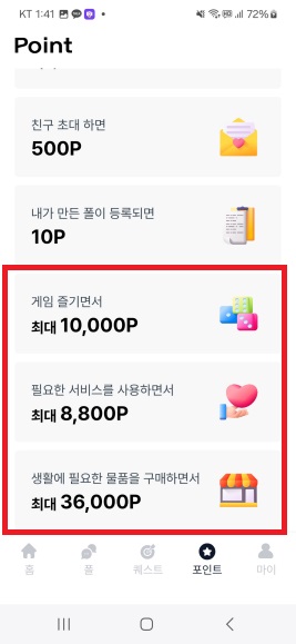 당장 위 사진만 봐도 10포인트를 주는 퀘스트들을 여러 개 보실 수 있습니다.