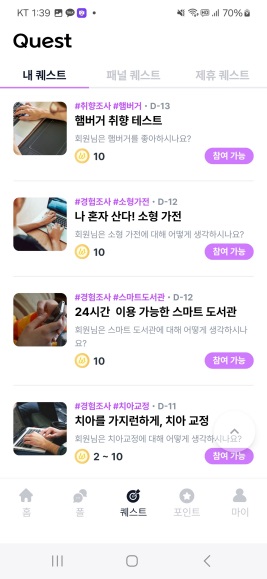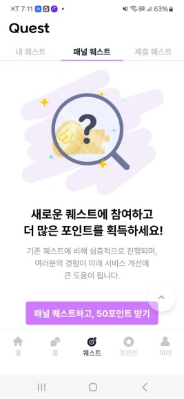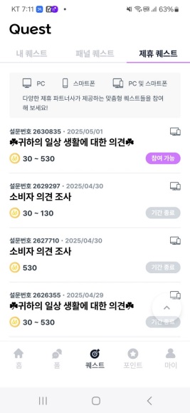 내 퀘스트 설문은 폴 설문과 유사하게 진행되지만, 문항과 선택지가 좀 더 많습니다. 그래서 폴보다는 시간이 조금 더 걸릴 수 있습니다. 하지만 그만큼 더 많은 포인트를 준답니다!