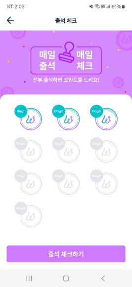 출석체크를 하면 2포인트를 받으며, 연속 출석체크 10회 완료 시 10~100 랜덤 포인트를 받습니다.