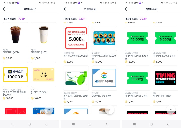 하지만 상품권 쪽이 꽤 쓸만한데요. 네이버페이 포인트, 편의점 금액권, 베이커리 금액 교환권, 올영 기프트카드, 컬쳐랜드 문화상품권, 다이소 금액권이 있고, 카카오T 이용권, 티빙 이용권, 주유소 금액권 같이 다른 앱에서 찾아보기 어려운 상품권들도 있습니다.