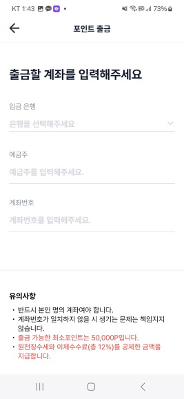거기에 원천징수세와 이체수수료 때문에 신청 금액의 12%를 공제한 금액이 지급됩니다.