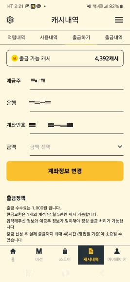 월 최대 출금 신청 가능 금액은 5만원이라고 합니다.
