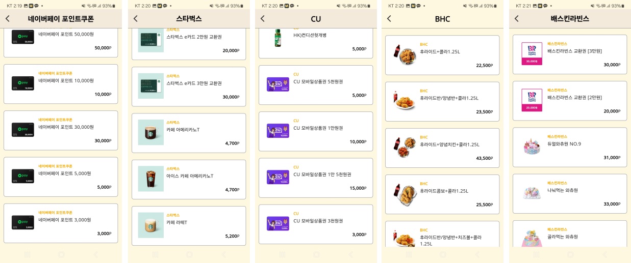 편의점, 카페, 분식, 햄버거, 치킨, 베이커리, 영화, 백화점, 잡화점(?), 외식, 마트상품권, 페이, 주유권 등 없는 것을 찾아보는게 더 힘들 정도입니다. 너무 많아서 전부 세어보는 것이 힘들 정도입니다. 여러분이 직접 도전해보실래요? 그리고 저한테도 알려주신다면 정말 감사하겠습니다.