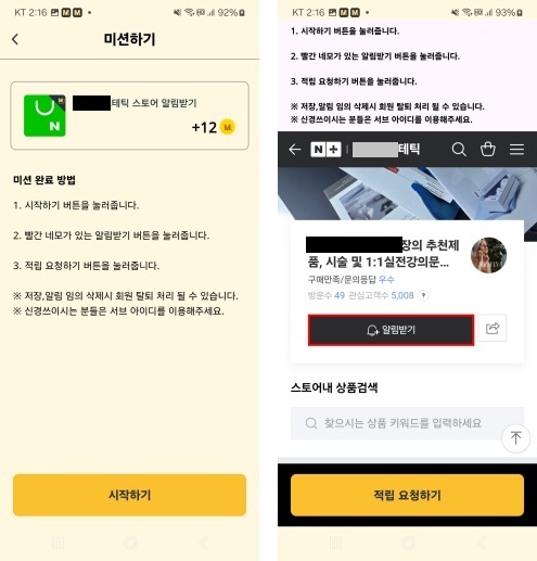저장미션에는 알림받기, 상품찜 등의 미션이 있습니다. 플레이스 저장미션처럼 N사이트 계정이 있어야 참여 가능합니다.