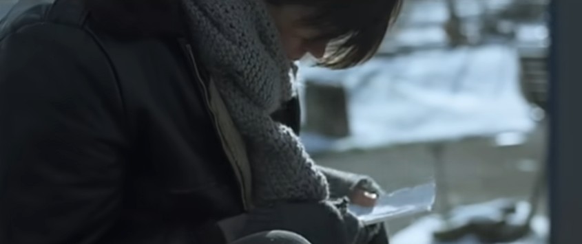 남자는 불현듯 재킷 주머니를 뒤지더니 아까 봤던 종이를 꺼내서 봅니다.