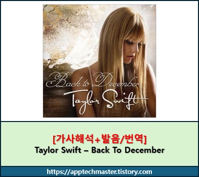지금 보고 계신 Back To December도 그렇습니다. 전 연인이었던 Taylor Lautner(테일러 로트너)에게 사과의 메시지를 담은 노래라고 합니다.
