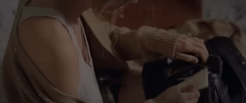 무언가가 적힌 종이를 어떤 검은 재킷 속에 집어넣습니다.