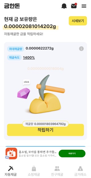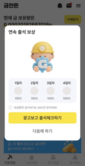 이미 말씀드렸다시피 금한돈은 방치형 앱테크입니다. 가입하고 아무것도 하지 않아도 금이 자동으로 채굴되지요.