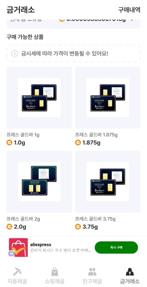 모바일 쿠폰으로도 교환할 수 있습니다. 교환할 수 있는 쿠폰으로는 편의점/배스킨라빈스/베이커리 금액권, 네이버페이 등이 있습니다. 잘 아시다시피 금 1g 얻는 것도 하늘의 별따기입니다. 금 대신 그냥 소소하게 즐기는 느낌의 방치형 앱테크라고 생각하시고 모바일 쿠폰 교환 기능을 이용해도 좋을 것 같습니다.
