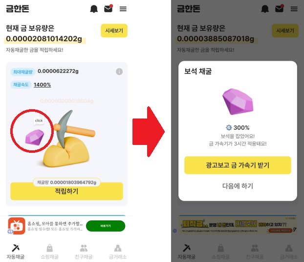 3) 보석(금 가속기)으로 자동 채굴속도 UP!