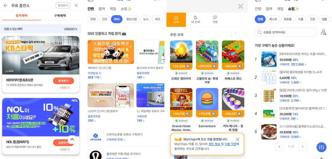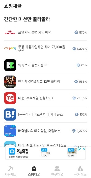 [쇼핑채굴]이라는 것도 있는데, 방금 본 미션과 뭔 차이가 있는지 잘 모르겠습니다. 방금 앱 다시 켜서 확인해봤는데도 뭐가 다른지 잘 모르겠네요. 😅 쇼핑몰 캐시백도 아니고, 쇼핑하듯이 미션을 골라서 한다는 그런 뜻인가 싶네요.