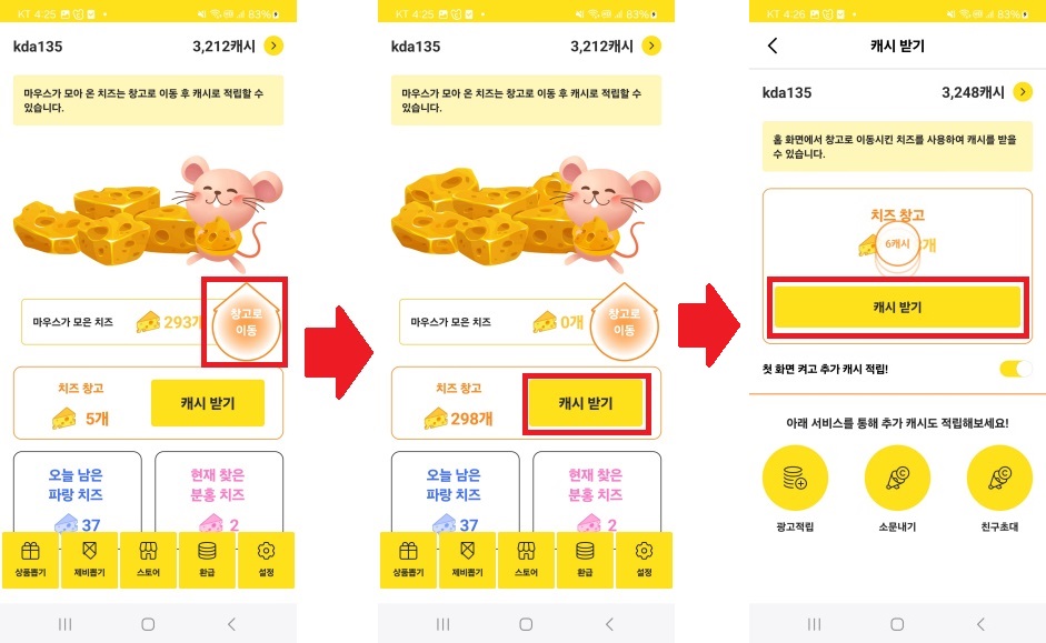 ☞ 노란 치즈 자동 적립 → 창고로 이동 → 캐시 교환