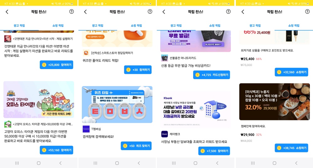 여러분도 잘 아시다시피 광고에 참여하고 캐시를 받는 콘텐츠입니다. 사이트 방문, 퀴즈 풀기, 앱 설치 또는 실행, SNS(인스타그램/페이스북/유튜브 등) 활동 참여, 게임 미션, 상담, 상품 구매 등을 하면 되지요. 다른 앱에서도 자주 경험해보셨을 것이기에 아시겠지만, 참여방법은 크게 다르지 않습니다.